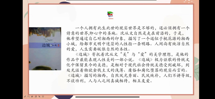 此次活动本着鼓励“全民阅读”的目的,通过分享交流,充分展现大学生的文学素养和理论知识,增进读书爱好者同学们之间的交流。交流会由主持人致辞并介绍书籍《边城》拉开序幕,同学们分享经典,积极发言,学习交流氛围浓厚。