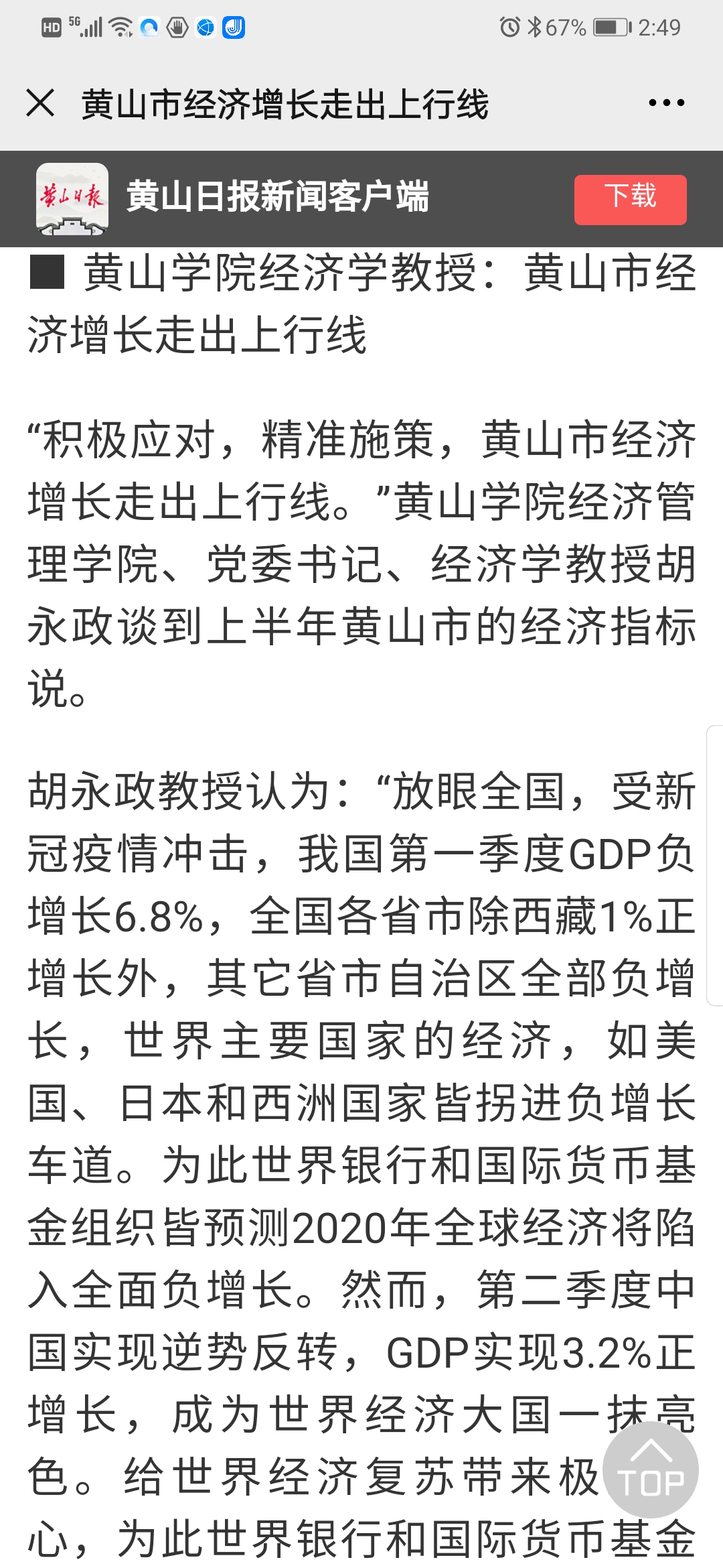 近日,《黄山日报》记者程向阳就黄山市经济发展态势对经济管理学院胡永政教授进行了专题访谈。胡永政以《黄山市经济增长走出上行线》为题,详细解读了黄山市第二季度经济增长态势。8月22日《黄山日报》刊发胡永政关于黄山市经济近期发展良好态势评论,并对黄山市未来经济发展给予积极预期。此次专题访谈是经济管理学院以高校智库价值为媒介,为地方媒体传播正能量发声,同时也是服务地方经济发展的重要表现。