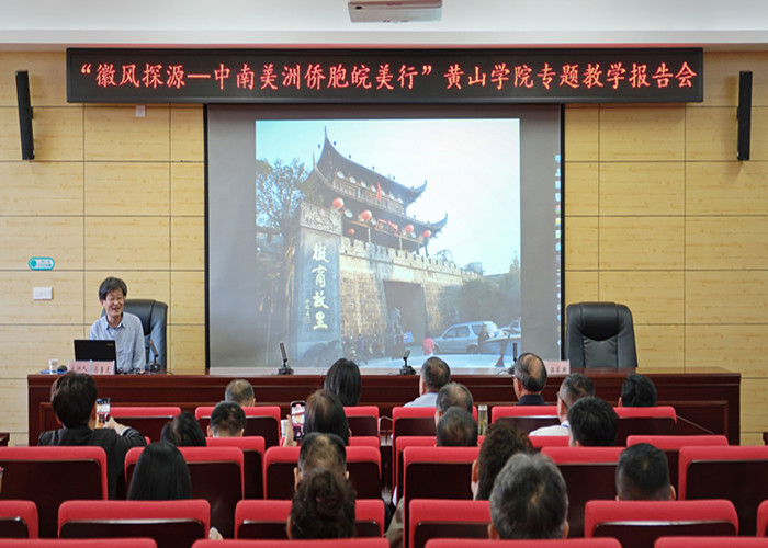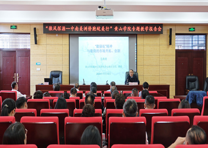 11月13日下午,由国务院侨办主办,安徽省委统战部承办的“徽风探源—中南美洲侨胞皖美行”活动走进我校,校徽州文化(非遗)研究中心主任马勇虎教授受邀在文昌楼南211会议室,作“徽骆驼精神与徽商的市场开拓、创新”专题教学报告。中央统战部九局四处四级调研员黄薇,安徽省委统战部二级调研员李光浩,黄山市委统战部副部长、侨办主任曹卫东以及来自中南美洲侨胞代表20余人参加报告会。报告会由校党委宣传(统战)部常务副部长汪家庚主持。
