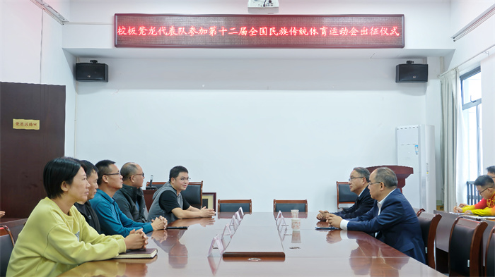 由国家民委和国家体育总局主办、海南省人民政府承办的中华人民共和国第十二届少数民族传统体育运动会,将于11月22日至30日在海南省三亚市举行。14日下午,我校板凳龙代表队参加第十二届全国少数民族传统体育运动会出征仪式在体育学院二楼会议室举行。参加仪式的有校党委委员、校体委主任、副院长张小明,宣传(统战)部常务副部长汪家庚,体育学院有关负责人和工作人员,板凳龙项目教练李谋涛及参赛运动员。仪式由体育学院党总支书记窦卉平主持。