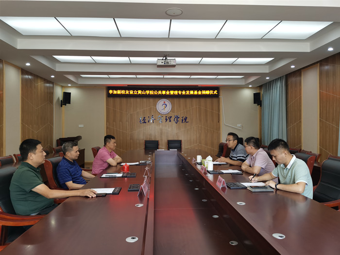 郭宏斌向李加新校友介绍了公共事业管理专业近年来建设发展情况以及取得的成绩。李加新在讲话中表示,作为学校的校友,对母校有着深厚的感情,树高千尺不忘根,此次捐赠也是希望通过自己的行动为母校的发展建设贡献一份力量。