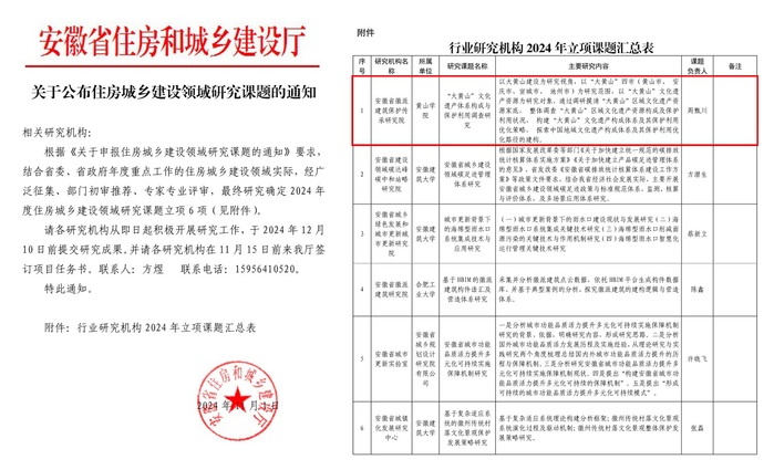 近日,安徽省住房和城乡建设厅公布了2024年住房城乡建设领域研究课题,我校省级科研平台——安徽省徽派建筑保护传承研究院申报的课题《“大黄山”文化遗产体系构成与保护利用调查研究》成功获得立项,资助经费为12万元,这是我校首次获得该领域的课题立项支持。
