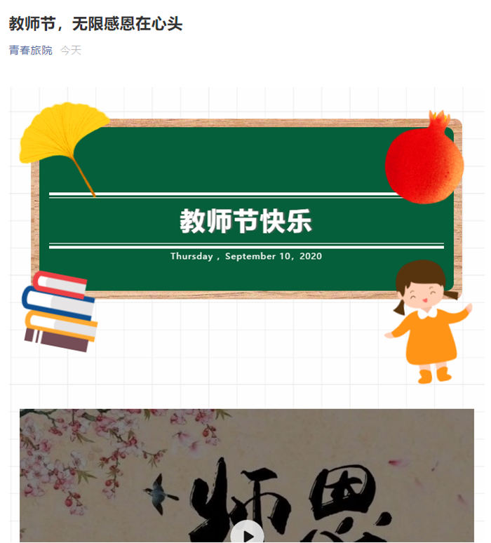 9月10日,该院微信公众号推送了精心制作的专题内容,通过“师风化雨·桃李芬芳”的主题表达了对老师们的祝福,院系同学们积极在评论区留言,表达出了自己对老师的心声,千言万语道不尽莘莘学子对老师的敬重与感恩。