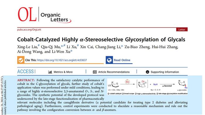 近日,我校化学化工学院副教授穆秋起、教授李长江与杭州师范大学教授徐利文合作的最新研究成果“Cobalt-Catalyzed Highly α‑Stereoselective Glycosylation of Glycals”在有机化学著名期刊Organic Letters上发表。Organic Letters由美国化学会(ACS)出版,是有机化学领域的权威期刊,属于中科院一区Top期刊,也是Nature Index收录期刊。