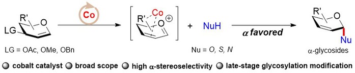 本研究基于前期工作“钴催化吲哚立体选择性C-糖基化”,进一步探索廉价金属钴催化烯糖O-,S-,N-糖基化中的应用,高立体选择性构建了系列2,3-不饱和O-, S-, N-糖苷。此外,发展的糖基化方法适用于2型糖尿病治疗药物恩格列净的后期官能团化。为进一步发展高效糖苷化新方法和新策略、及新型糖苷的设计合成奠定了理论实践基础。