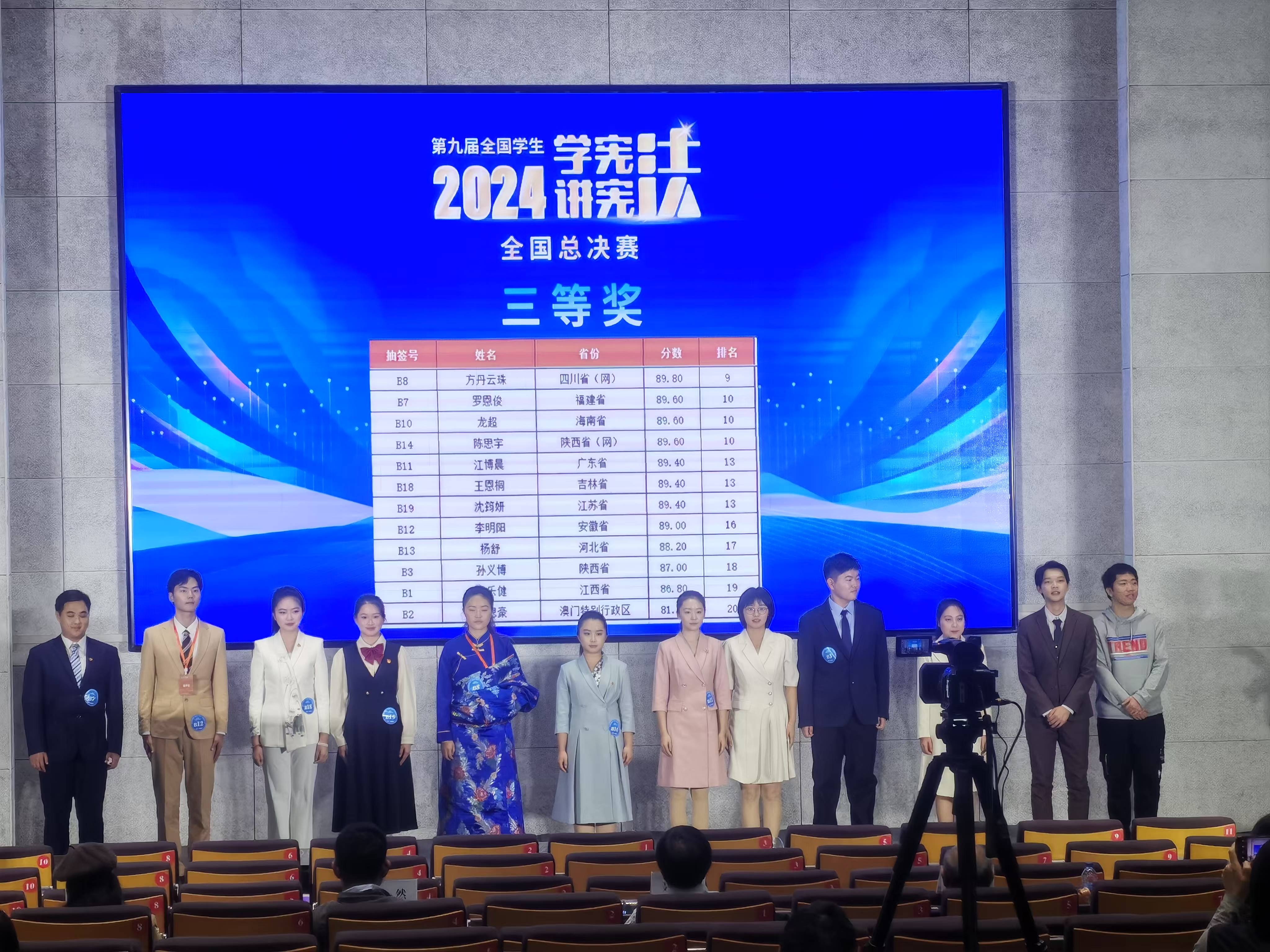 近日,由教育部主办、北京外国语大学全国青少年法治教育中心承办的第九届全国学生“学宪法 讲宪法”活动全国总决赛顺利举办,由我校教师廖荣军指导的文化与传播学院22级播音与主持艺术专业李明阳荣获演讲比赛高校组三等奖。