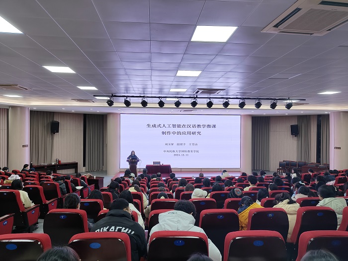12月12日晚,中央民族大学大学刘云屏教授应邀来我校作题为《生成式人工智能在汉语教学微课制作中的应用研究》的学术报告。报告在文端楼二楼报告厅举行,全校新进博士、文学院师生近200人参加活动,文学院院长沈昌明主持报告会。