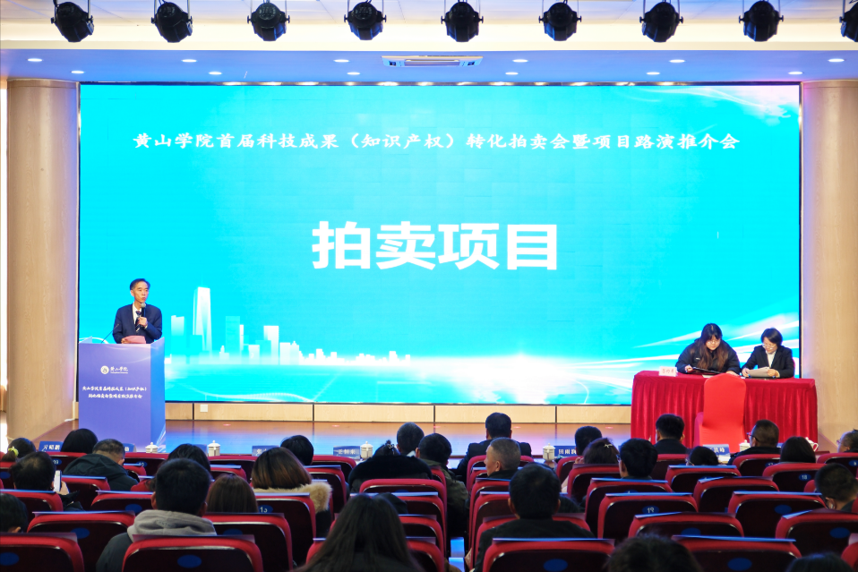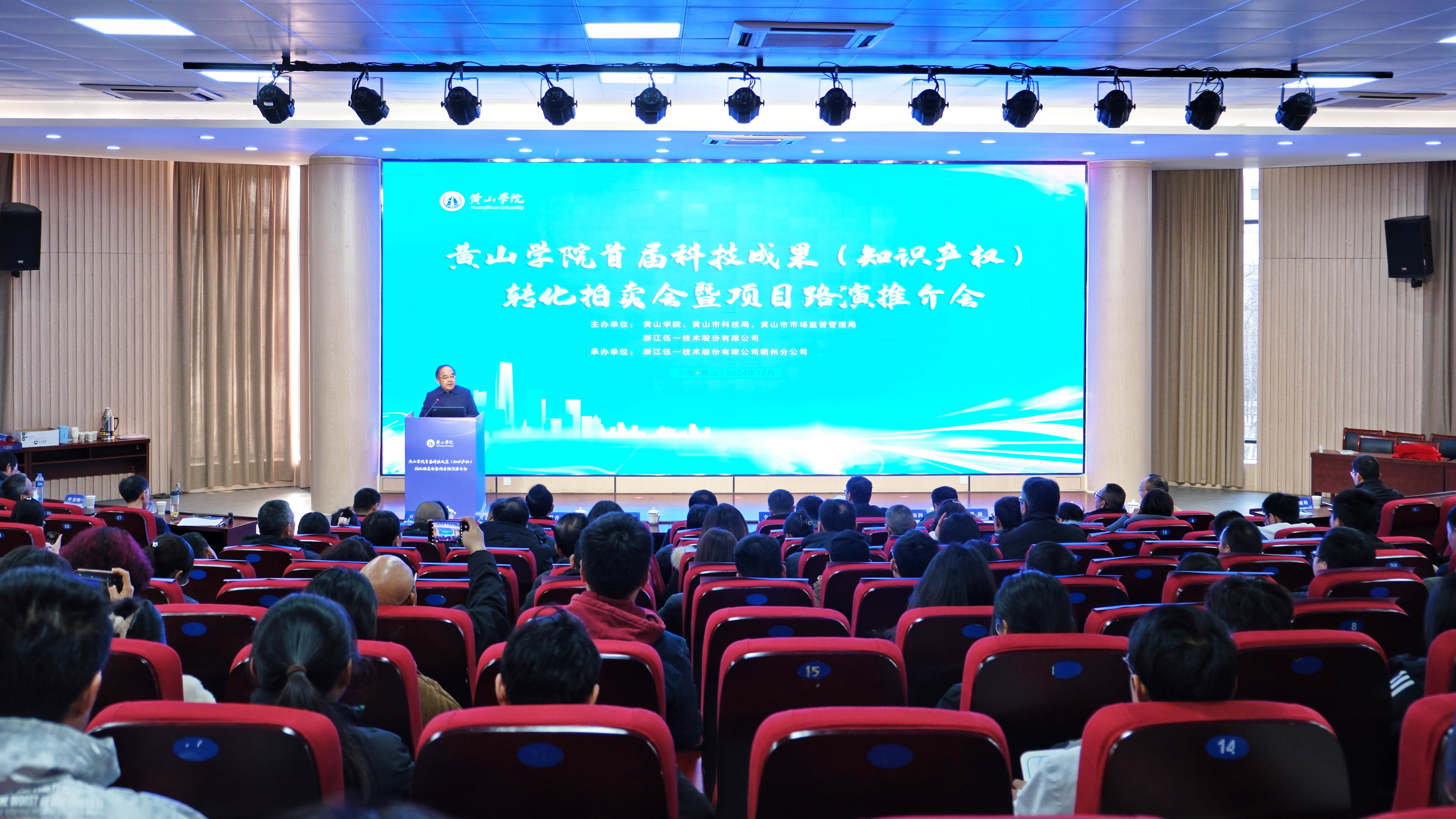 12月20日下午,我校首届科技成果(知识产权)转化拍卖会暨项目路演推介会在率水校区文端楼二楼报告厅举行。校党委副书记、院长李庆宏,黄山市副市长王恒来,浙江伍一技术有限公司董事长姜小栋等出席活动,开幕仪式由校党委委员、副院长张小明主持。省内外企业家代表50余人、师生代表200余人参加活动。