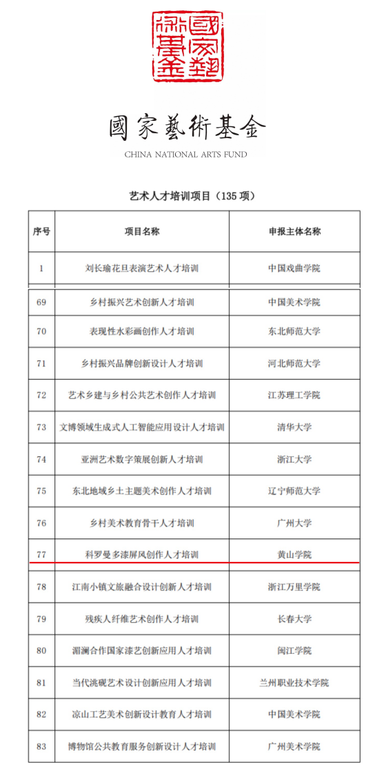 近日,国家艺术基金管理中心公布了国家艺术基金2025年度资助项目名单,我校艺术学院刘元元、梁军等人申报的《抢救、传承与创新——科罗曼多漆屏风创作人才培训》获批艺术人才培训项目资助,申请金额100.76万元,实现了我校获批国家级人文社科项目的新突破。
