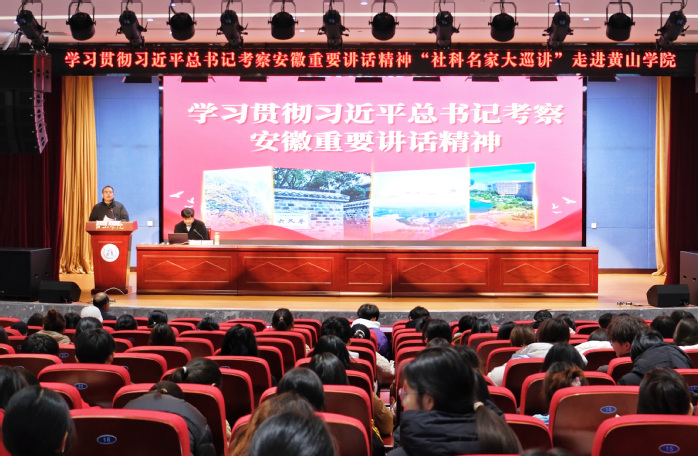 12月25日下午,学习贯彻习近平总书记考察安徽重要讲话精神“社科名家大巡讲”专题报告会在我校文博楼二楼报告厅举行。省“社科名家大巡讲”宣讲团成员、淮北师范大学副校长余敏辉教授作专题宣讲报告。处级干部,文学院、旅游学院、艺术学院、外国语学院、建筑工程学院、文化与传播学院师生代表近300人参加报告会。报告会由党委副书记、院长李庆宏主持。
