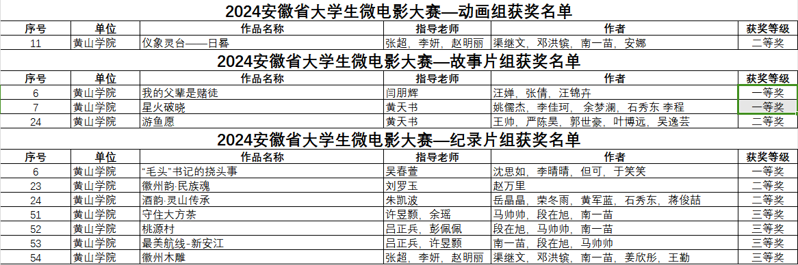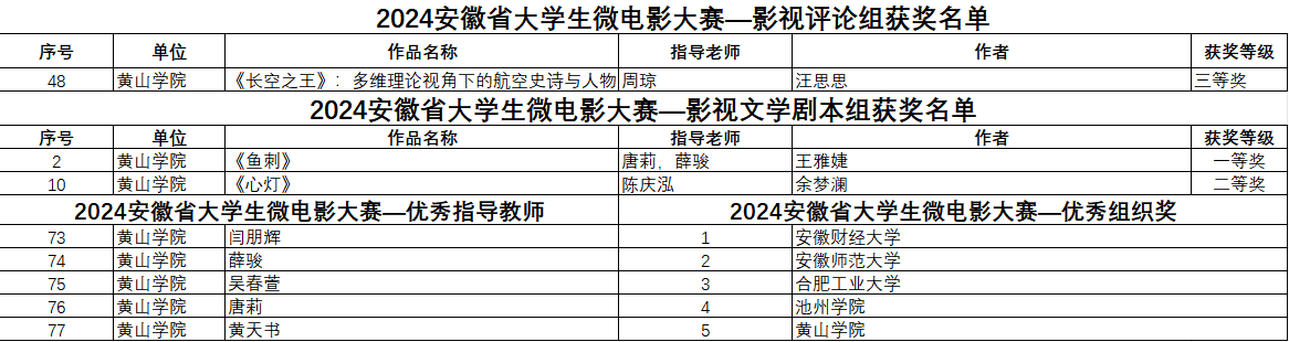 近日,由安徽省教育厅主办、安徽财经大学承办的2024年安徽省大学生微电影大赛终评会在安徽财经大学举行,圆满完成大赛各项议程。经过激烈角逐,我校文化与传播学院师生共获奖14项,其中《我的父辈是赌徒》《星火破晓》获故事片组一等奖,《“毛头”书记的挠头事》获纪录片组一等奖,《鱼刺》获影视文学剧本组一等奖;《仪像灵台——日晷》获动画组二等奖,《游鱼愿》获故事片组二等奖,《徽州韵·民族魂》《酒韵·灵山传承》获纪录片组二等奖,《心灯》获影视文学剧本组二等奖;《守住大方茶》《桃源村》《最美航线—新安江》《徽州木雕》获纪录片组三等奖,《〈长空之王〉:多维理论视角下的航空史诗与人物塑造》获影视评论组三等奖,闫朋辉、薛骏、吴春萱、唐莉、黄天书等5位教师荣膺“优秀指导教师”称号,博业体育(中国)官方网站-登录入口荣获“优秀组织奖”。