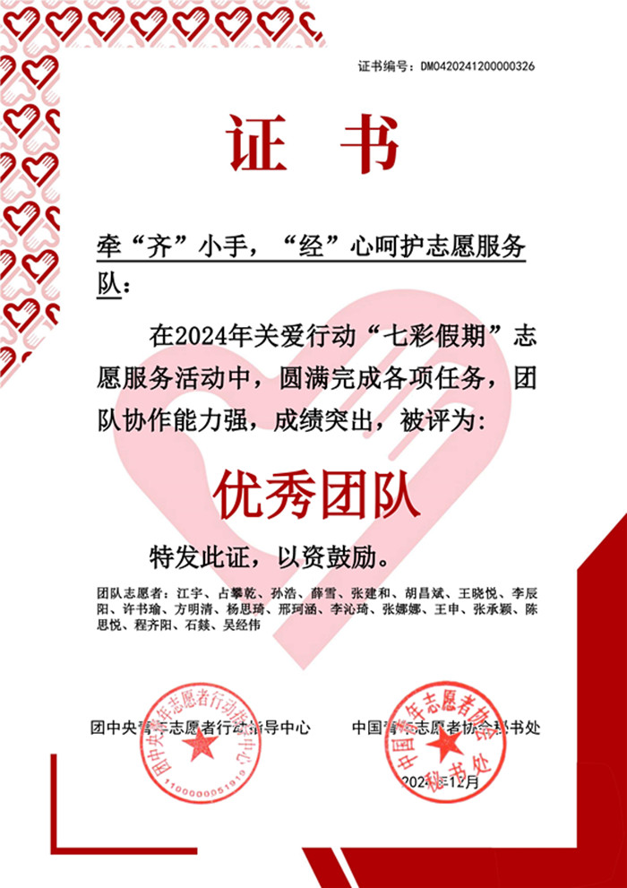 近日,我校牵“齐”小手·“经”心呵护志愿服务队在全国2024年关爱行动“七彩假期”志愿服务活动中,圆满完成各项任务,团队协作能力强,成绩突出,被评为全国优秀团队。