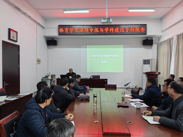 12月25日,安徽师范大学席玉宝教授应邀为我校体育学院师生作题为《课题申报与学科建设专题报告》的学术报告。报告会在风雨操场二楼体育学院会议室举行。学院近80名师生参加活动。学院党总支书记窦卉平主持报告会。