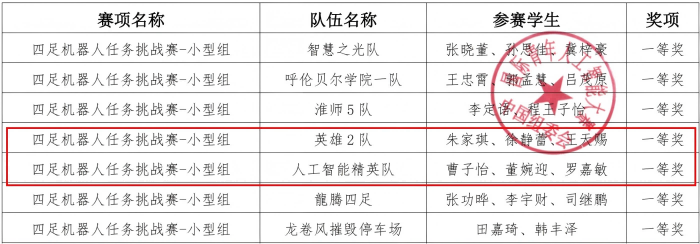 12月7日,第六届国际青年人工智能大赛总决赛在河北省保定市雄安新区落幕。来自全国高校的300余名杰出青年学子展开了激烈角逐,展示他们在人工智能领域的卓越才华。我校信息工程学院软件工程专业22级学子朱家琪、计算机科学与技术专业22级学子曹子怡等参加了总决赛,并在“四足机器人任务挑战赛-小型组”中荣获国赛一等奖2项、三等奖5项,“四足机器人任务挑战赛-中型组”三等奖3项。