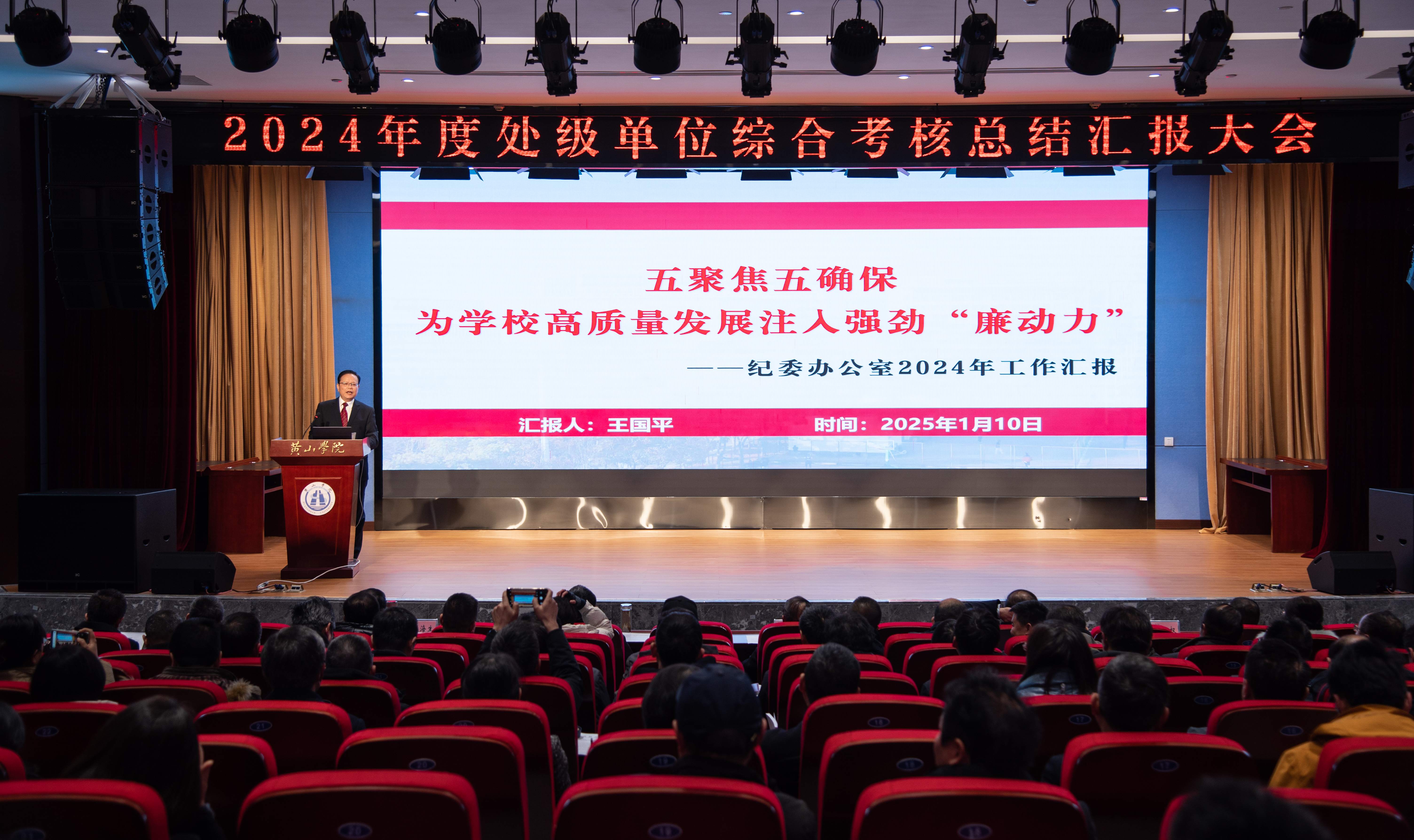 1月10日,我校在文博楼二楼报告厅召开2024年度处级单位综合考核总结汇报大会。校党委书记李铁范,校党委副书记、院长李庆宏,校党委委员、副院长张小明,校党委委员、纪委书记、监察专员胡海生,校党委委员、组织部部长周权出席会议。大会由李铁范主持。