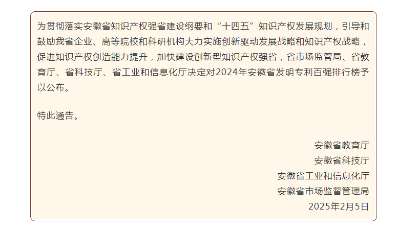 2月5日,安徽省教育厅、安徽省科技厅、安徽省工业和信息化厅、安徽省市场监督管理局联合发布了2024年安徽省发明专利百强排行榜,我校再次上榜。这是自2015年安徽省首次发布发明专利百强榜以来,我校第九次登榜。