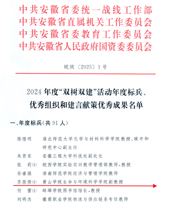 近日,中共安徽省委统战部、省直机关工委、省委教育工委、省国资委联合发文,对2024年度党外知识分子“双树双建”主题教育活动年度标兵、优秀组织和建言献策优秀成果进行通报表彰,我校生命与环境科学学院教师苏胜荣喜获年度标兵荣誉称号。
