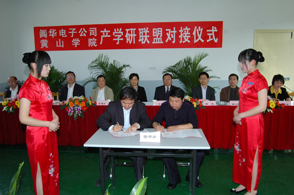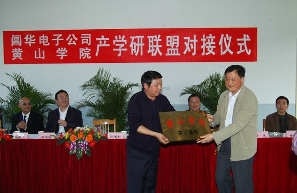 在阊华电子公司,我校与该公司举行了产学研联盟对接仪式。学校与阊华电子公司签订了该公司为博业体育(中国)官方网站-登录入口教学实践基地的合作协议书,并授予教学实习基地牌匾。在仪式上,祁门县领导向博业体育(中国)官方网站-登录入口5位教师颁发政府科技特聘员证书,向3位教师颁发阊华公司技术顾问证书。