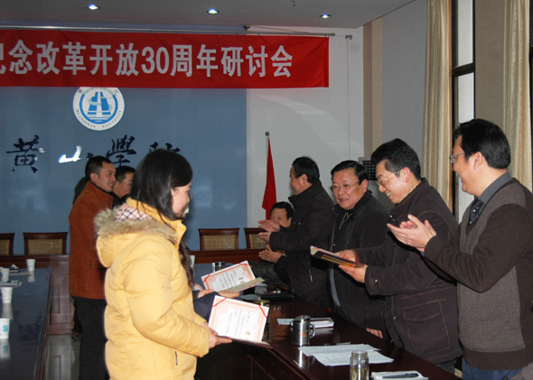 研讨会上,汪路金、高文、戎渊、孙海霞、吴云峰、章咏秋等6位获奖论文作者先后发言。他们的发言紧紧围绕我国改革开放30年的历史进程,既有关于中共三代领导人对我国社会主义发展阶段的探索历程的研究,也有我们党不断解放思想,与时俱进,取得辉煌发展成果的分析;既有关于我国传统的和合观对社会主义和谐社会构建中的道德建设有益启示的深刻剖析,也有对公民的主体性精神及其培养的深入思考;既有邓小平、江泽民旅游经济思想对黄山旅游业发展促进作用的探讨,也有对新形势下校园文化建设的探析。发言内容涵盖经济、政治、文化、道德建设、校园文化建设等多个领域,对有关理论和现实问题进行了深入的思考,具有一定的理论深度和实践意义。