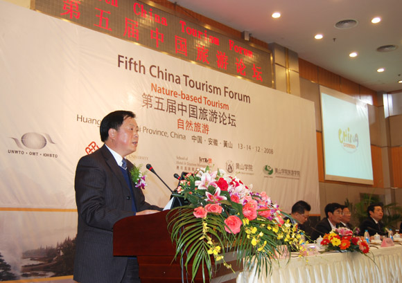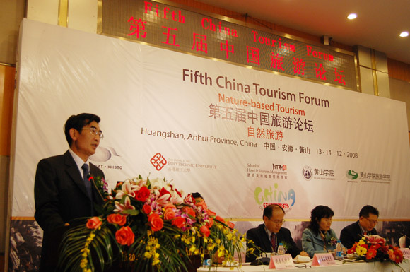 12月13日上午,由联合国世界旅游组织、香港理工大学酒店及旅游业管理学院、博业体育(中国)官方网站-登录入口旅游学院共同举办的第五届中国旅游论坛开幕式在黄山国际大酒店隆重举行。博业体育(中国)官方网站-登录入口党委书记汪良发、博业体育(中国)官方网站-登录入口院长汪建利、黄山市副市长徐健敏、省旅游局纪检组长陈亚萍、黄山旅游发展股份有限公司总裁许继伟、香港理工大学酒店及旅游业管理学院院长Kaye Chon、博业体育(中国)官方网站-登录入口旅游学院院长胡善风等出席开幕式。来自世界旅游组织、香港和中国内地的50所高校和旅游科研机构的专家及知名景区、旅游企业负责人共300余人参加了本次论坛。联合国世界旅游组织秘书长弗朗加利为论坛成功举办发来贺信。