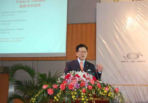 Kaye Chon代表香港理工大学酒店及旅游业管理学院致辞,他首先对来自世界各地的专家和学者表示欢迎,希望论坛为各界提供一个交流、沟通的平台,鼓励大家参与讨论旅游发展对中国产生的影响,以及旅游业与民族地区发展的相关问题。他表示,香港理工大学酒店及旅游业管理学院致力于带领旅游学术界和业界对中国旅游的相关问题进行深入探讨,并乐意为中国旅游业的发展做出贡献。