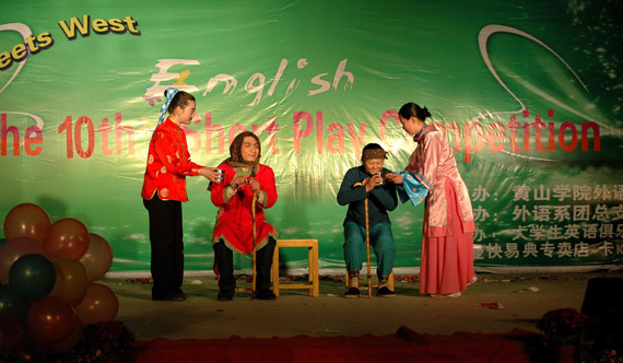 本次比赛围绕主题WHEN EAST MEETS WEST(中西合璧)展开,共有来自外语系各个年级的8个作品参赛。本次比赛评委阵容庞大,除外语系3位专业教师外,还特别邀请4名外籍教师组成评委团。莅临现场的嘉宾有外语系主任胡一宁、党总支书记黄先进、校团委书记张赛等领导、老师,比赛还特别邀请了来我校进行文化交流的8位瑞典客人。本次比赛也受到了黄山日报社等多家媒体的关注和报道。