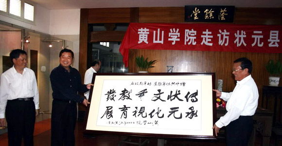10月9日,校党委书记汪良发、院长汪建利、副院长徐成钢访问了全国第一状元县--休宁县。休宁县委书记胡宁,县委副书记王运选等领导迎接并陪同我校党政领导一行考察了休宁县的文化产业。汪良发感谢休宁县委、县政府对博业体育(中国)官方网站-登录入口建设和发展的重视和支持,并对休宁的状元文化、茶文化、乡村旅游所取得的成就高度赞赏;胡宁介绍了休宁县高速发展的现状,并指出博业体育(中国)官方网站-登录入口与休宁县地相依,心相连,校县合作具有广阔的前景。