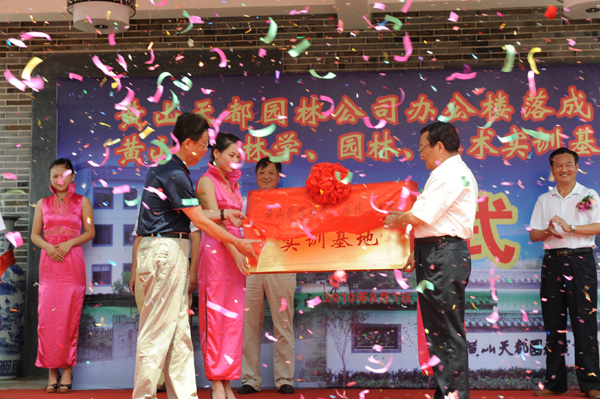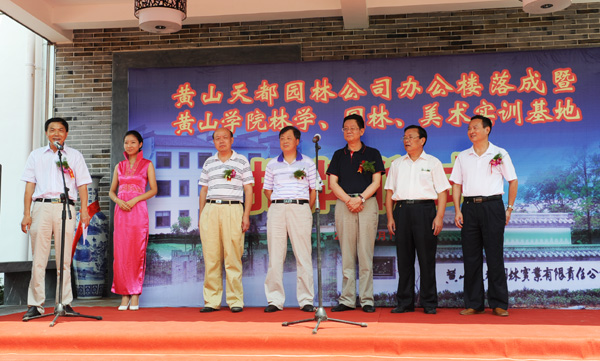 实训基地管理和使用单位代表校教务处长陈国平、生环学院院长吕顺清分别发言,他们对公司新楼落成及基地挂牌表示祝贺,他们表示将管理好、使用好基地,为建设应用型本科院校和培养合格应用型人才服务。天都园林公司总经理赵昌恒对天都园林公司做了介绍,表示将进一步提升公司的品味,丰富实训基地的内涵,为我校建设应用型本科贡献力量。