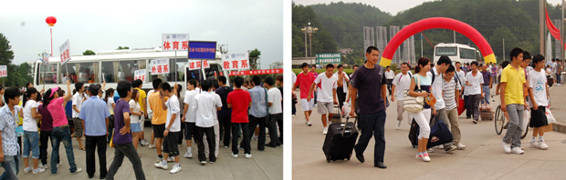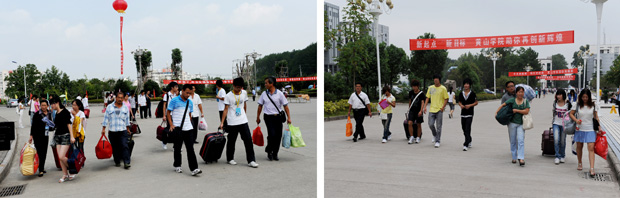 9月11日是新生报到的第一天。一大早,迎新的各项准备工作早已就绪,部分院系还为提前到校的新生及家长做了妥善安排。校训墙广场,一顶顶整齐的迎新帐篷一字排开,一个个迎新志愿者忙前忙后,一辆辆迎新校车穿梭于校园,一个个院系标牌笑迎新生。美丽的喷泉、高高拱起的彩虹门、迎风飘扬的大红气球、欢快的音乐、鲜艳的彩旗、大红的条幅、个性鲜明的指示牌等,营造着热烈的迎新气氛。