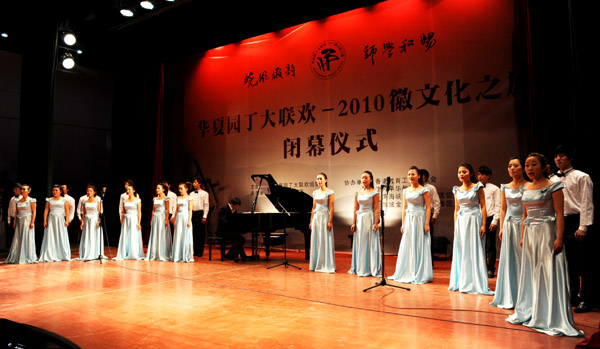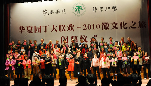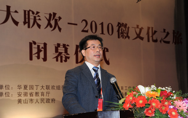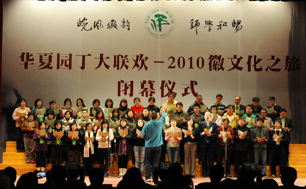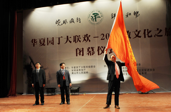 闭幕式上,两岸四地的园丁代表先后发言,畅谈此次“华夏园丁大联欢-2010徽文化之旅”活动的收获和感触,对组委会的精心组织和周到服务表示感谢。宋波致闭幕辞,李和平和下一届活动承办单位代表陈湘生分别致辞。闭幕式进行了会旗交接仪式。闭幕式由汪良发主持。
