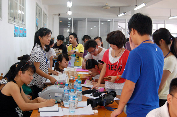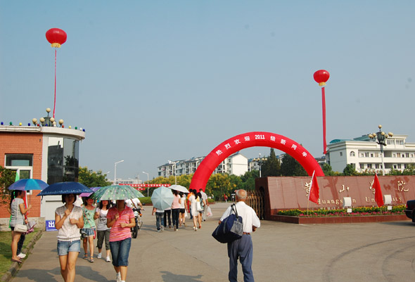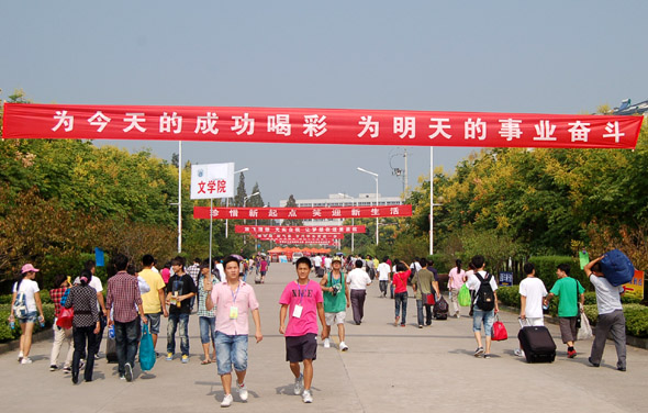 今年我校新生分别在南北两个校区同时报到。南校区在学校迎新工作领导组统一指挥下,由院系自主组织开展迎新报到工作;北校区在图书馆一楼大厅设置了集中报到点。针对家庭贫困的新生,我校积极响应国家号召,专门开通了“绿色通道”,专人、专项办理这些学生的入学手续,确保这些学生顺利入学。