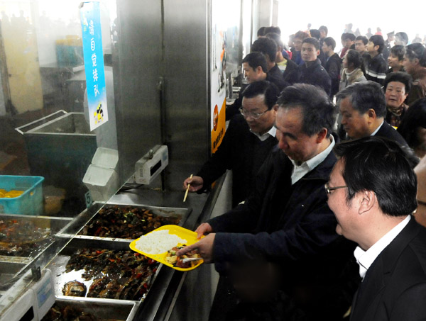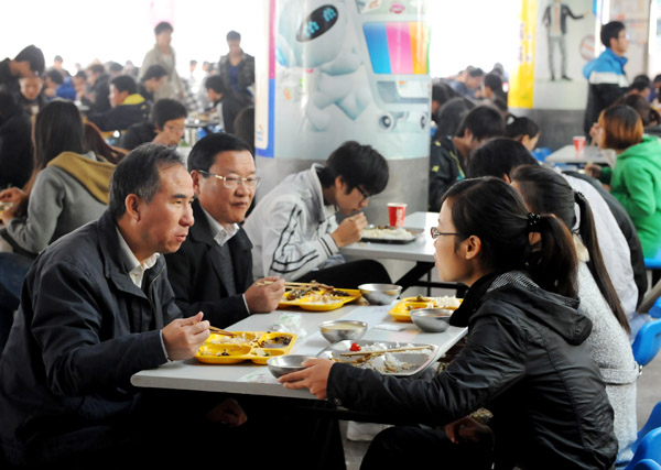 11月25日上午11点50分左右,安徽省委教育工委书记、省教育厅厅长程艺走进我校南区食堂,来到食堂学生窗口打好饭菜,并与09国际贸易专业的王静、杜文敏两位同学同桌用餐,边吃边聊。程艺详细询问了两位同学在生活、学习方面的情况,分别就伙食价格、专业学习、暑期实践、业余活动、奖学金发放、未来就业等与两位同学谈心。程艺用餐离开后,杜文敏笑着对记者说:“厅长平易近人,他还把他的菜夹给我吃!”