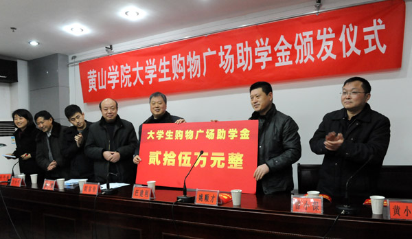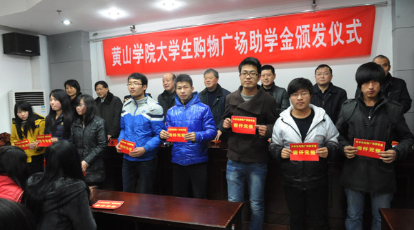 3月7日下午,我校在逸夫图书馆一楼会议室举行博业体育(中国)官方网站-登录入口大学生购物广场助学金颁发仪式。 院长汪建利、副院长胡家俊,瑞隆商贸有限公司总经理姚顺才、黄山市食汇点连锁店营运部经理姚健,国有资产管理处、财务处、宣传部负责人出席了颁发仪式。