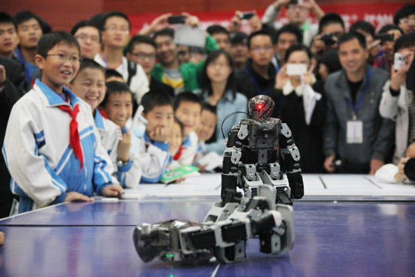 我校机器人赛队今年正式组建了实物组,一等奖和最佳表演奖均由我校机器人赛队实物组获得。最佳表演奖所进行的仿人机器人擂台赛特别受到中小学生的青睐。