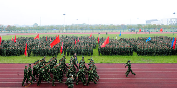 9月28日上午,我校2013级新生开学典礼暨军训汇报总结大会在南区田径场隆重举行。4000多名新生身着迷彩服,以威武的军姿、嘹亮的口号、整齐的方阵,展现了大学生的青春风采。