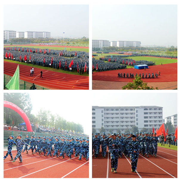 来自14个学院的65个军训方队在雄壮的《中国人民解放军进行曲》中进行分列式汇报展示