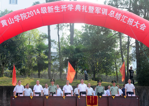 2014级全体新生及有关院部、部门负责人、武警黄山市支队部分官兵参加大会。