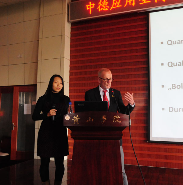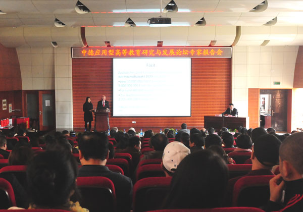三位德国专家围绕德国应用性大学建设作专题报告。原德国下萨克森州科文部高校发展规划处处长、安徽省教育厅特聘顾问卡尔-恩斯特•菲希特教授作了题为《德国应用型高等教育的新发展》的报告,从德国应用型高校的数量、质量保障和质量管理、体制变革和体制体系的透明度四个方面进行了阐述;德国安哈尔特应用技术大学机电经济工程学系教授、主管外事工作负责人奥托•克斯腾教授作了题为《德国应用技术大学以实践为导向的人才培养》的报告,探讨了德国应用技术大学的人才培养模式,并以数据和图表的方式证明应用型大学培养的人才更受市场青睐;德国奥斯纳布吕克应用科学大学国民经济学教授、安徽省应用型大学发展顾问卡尔威廉•布鲁姆教授作了题为《传统大学与应用型大学的区别》的报告。