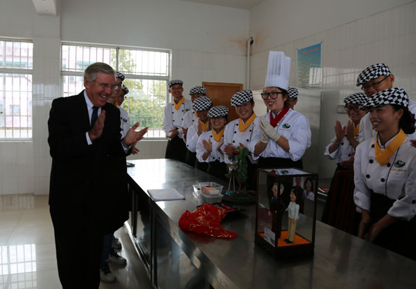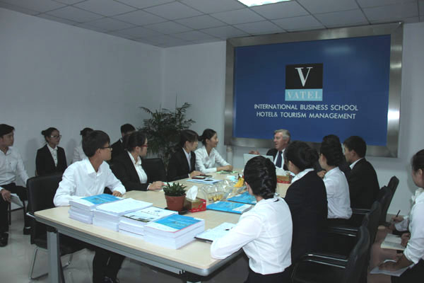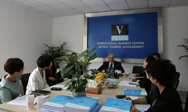 在瓦岱勒(Vatel)教学楼,安东尼•卡尔斯先生与旅游学院教师代表、学生代表和学校有关职能部门负责人分别进行座谈,深入了解旅游学院专业教育情况。晚间,烹饪与营养教育、酒店管理专业的学生为安东尼•卡尔斯展示了专业技艺和服务技能。