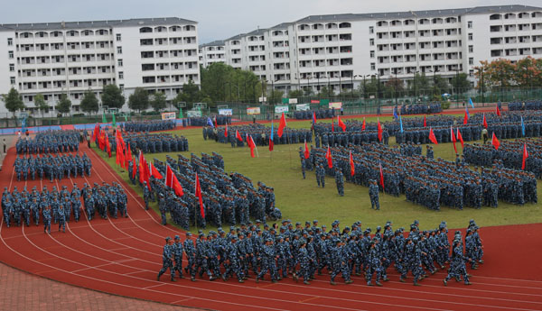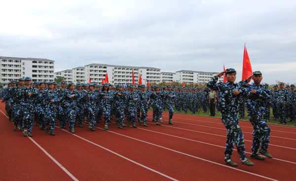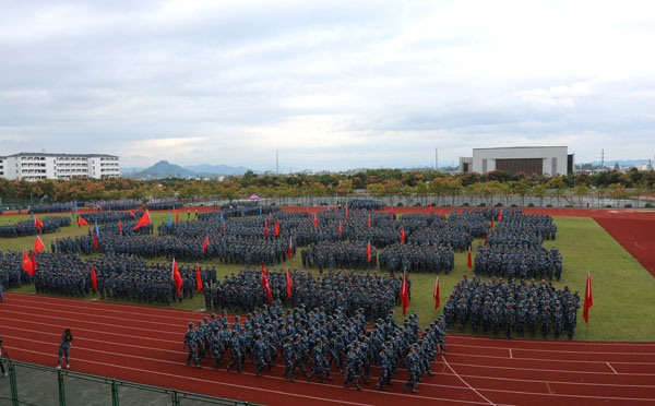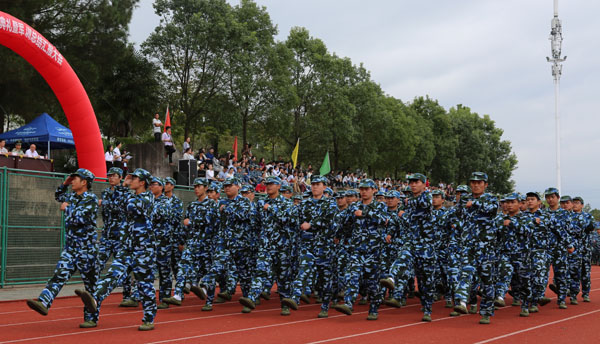 来自14个学院的57个军训方队进行分列式汇报展示