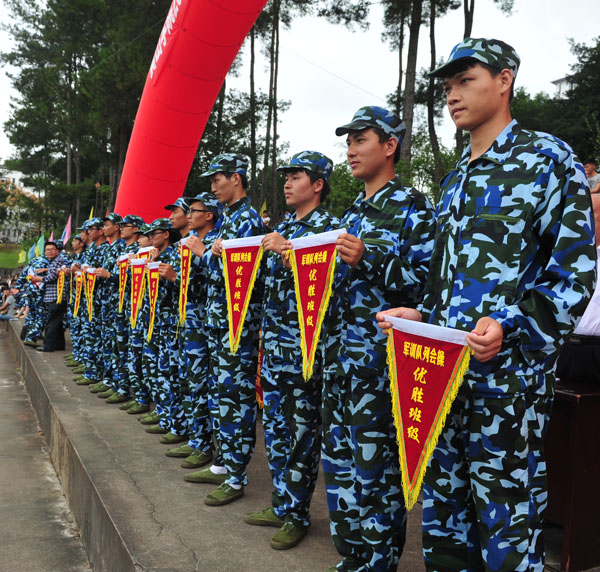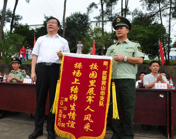 会上,徐成钢代表学校向武警黄山市支队赠送锦旗;胡家俊宣读军训会操优胜班级、内务整理优秀寝室表彰决定,校领导和部队领导为获奖单位颁奖。