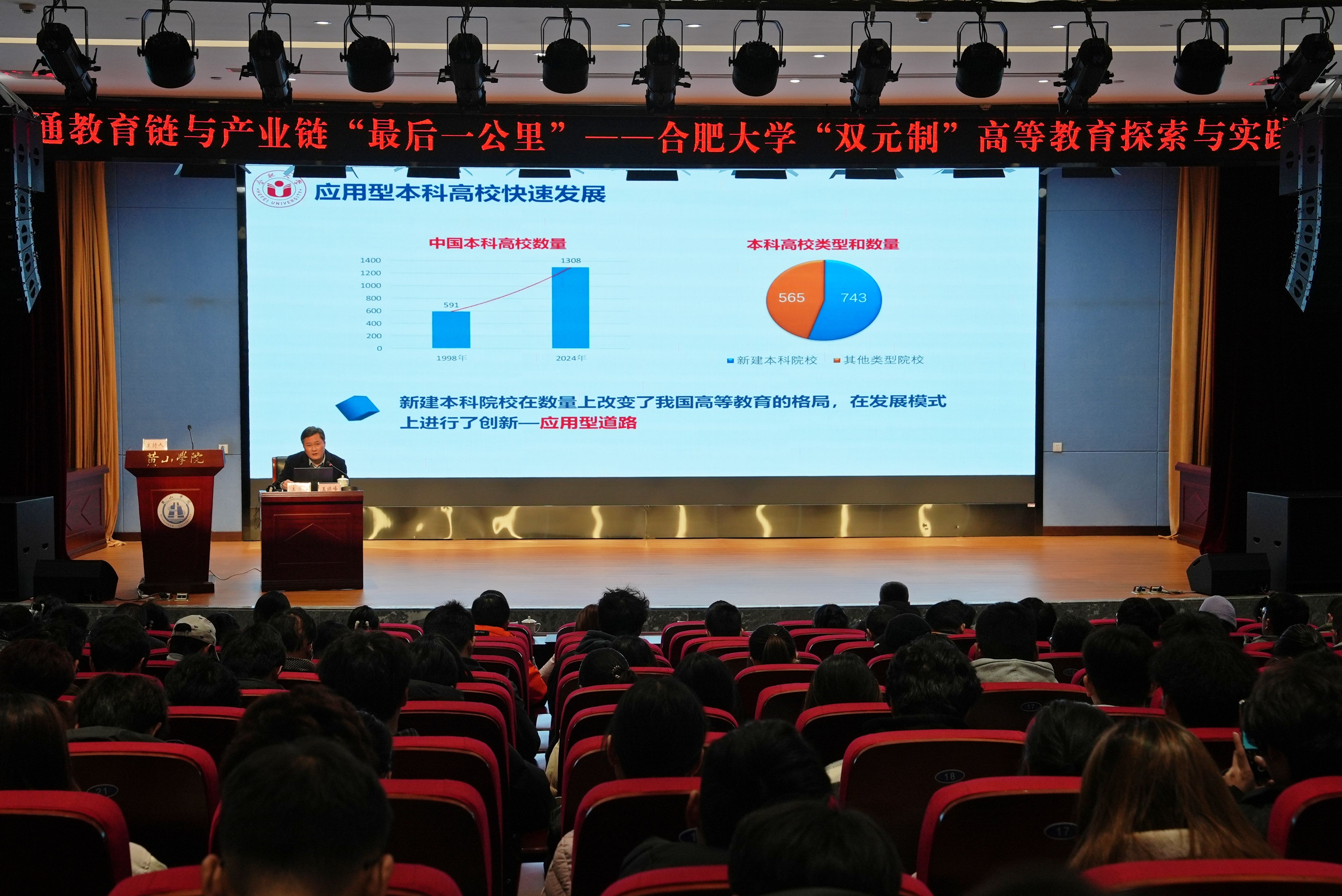 3月5日下午,合肥大学党委委员、副校长王晓峰教授应邀在我校率水校区文博楼二楼报告厅作题为《打通教育链与产业链‘最后一公里’——合肥大学‘双元制’高等教育探索与实践》的学术报告。全校300余名师生参加,报告会由副院长姜红主持。
