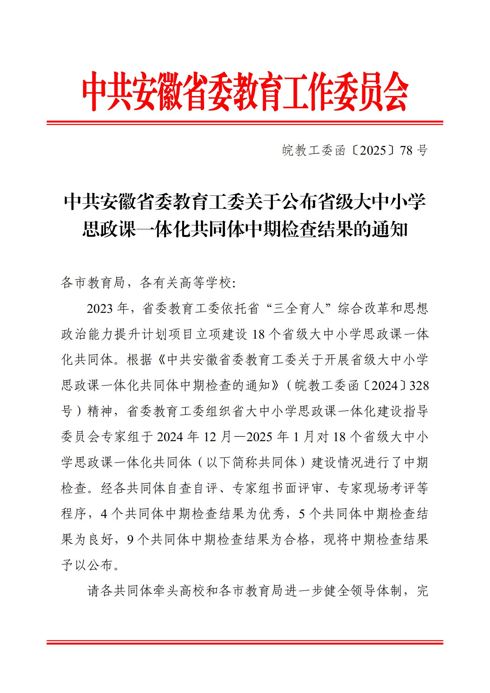 近日,中共安徽省委教育工委公布省级大中小学思政课一体化共同体中期检查结果,我校作为牵头高校建设的黄山市大中小学思政课一体化共同体喜获优秀等次,位列全省四个优秀共同体之一。这一成果标志着我校在大思政课建设领域实现新突破,为区域教育高质量发展注入新动能。