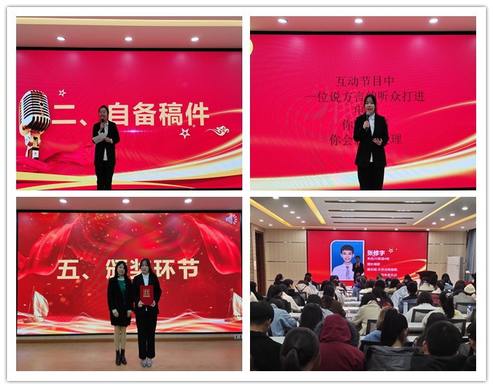比赛分为选手自我介绍及才艺展示、选手自备稿件、即兴主持及评委点评四个环节。第一个环节中,选手们充分展现自己的特长,进行了风格各异的自我介绍和才艺展示,他们的精彩表演赢得了观众的热烈掌声。第二个环节中,选手朗诵稿件,歌颂祖国,淋漓尽致地展现他们的朗诵技巧。第三个环节的即兴主持设置了随机主持项目,让选手对选择的稿件进行解读,充分考验了选手的语言功底和临场应变能力。比赛结束后,团总支负责人陈铭对整场比赛作点评。