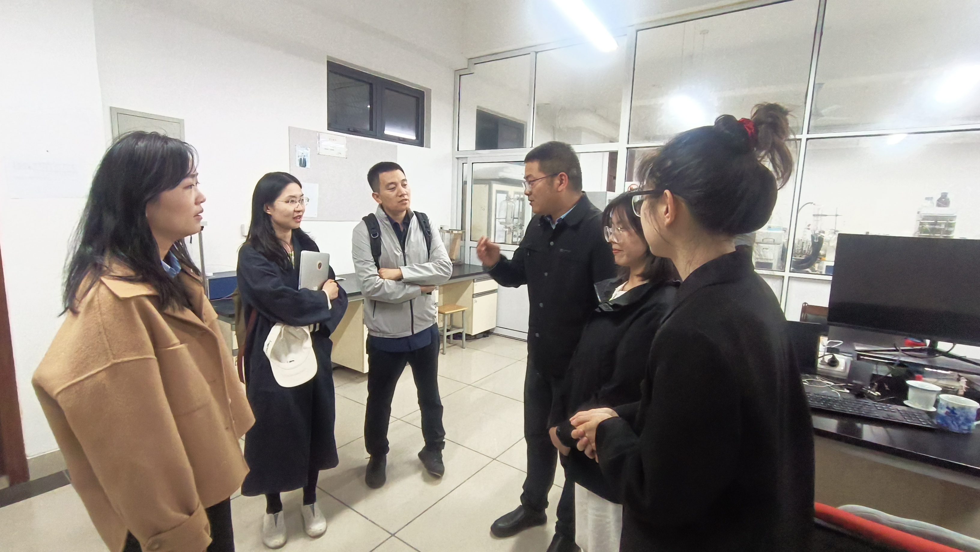 座谈会结束后,新华社记者一行实地考察了化学化工学院实验室,与“聚酯合成及粉末”微专业合作企业黄山正杰新材料有限公司人力资源经理及完成微专业课程的同学进行面对面交流。