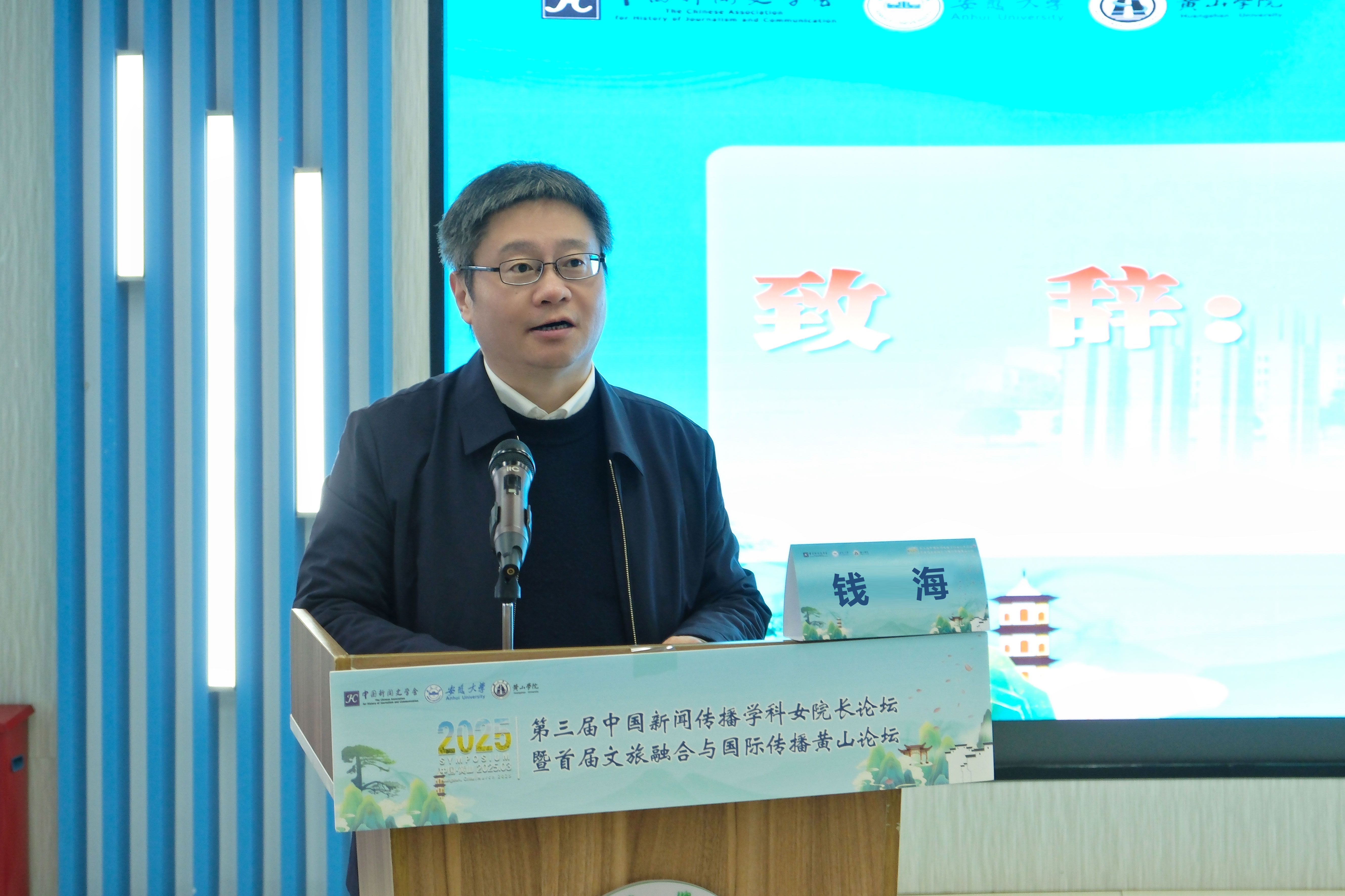 钱海在致辞中代表安徽大学向参加本次论坛的各位领导与院长、专家学者以及业界同仁表示最热烈的欢迎与最诚挚的感谢。他指出,多年来,女性力量在新闻传播学科发展过程中彰显出得天独厚的重要性,各位女院长凭借宏远的学术胸怀,敏锐的学术眼光,精深的学术积淀,为学科发展注入新活力,开拓新方向,提升新高度,为我国新闻传播学科建设、人才培养、国际交流合作等方面作出了卓越的贡献。希望各位院长能够在本次论坛中分享各自在学科建设、人才培养、学术研究、国际教育等方面的经验和成果,共同推动新闻传播学科的高质量发展。