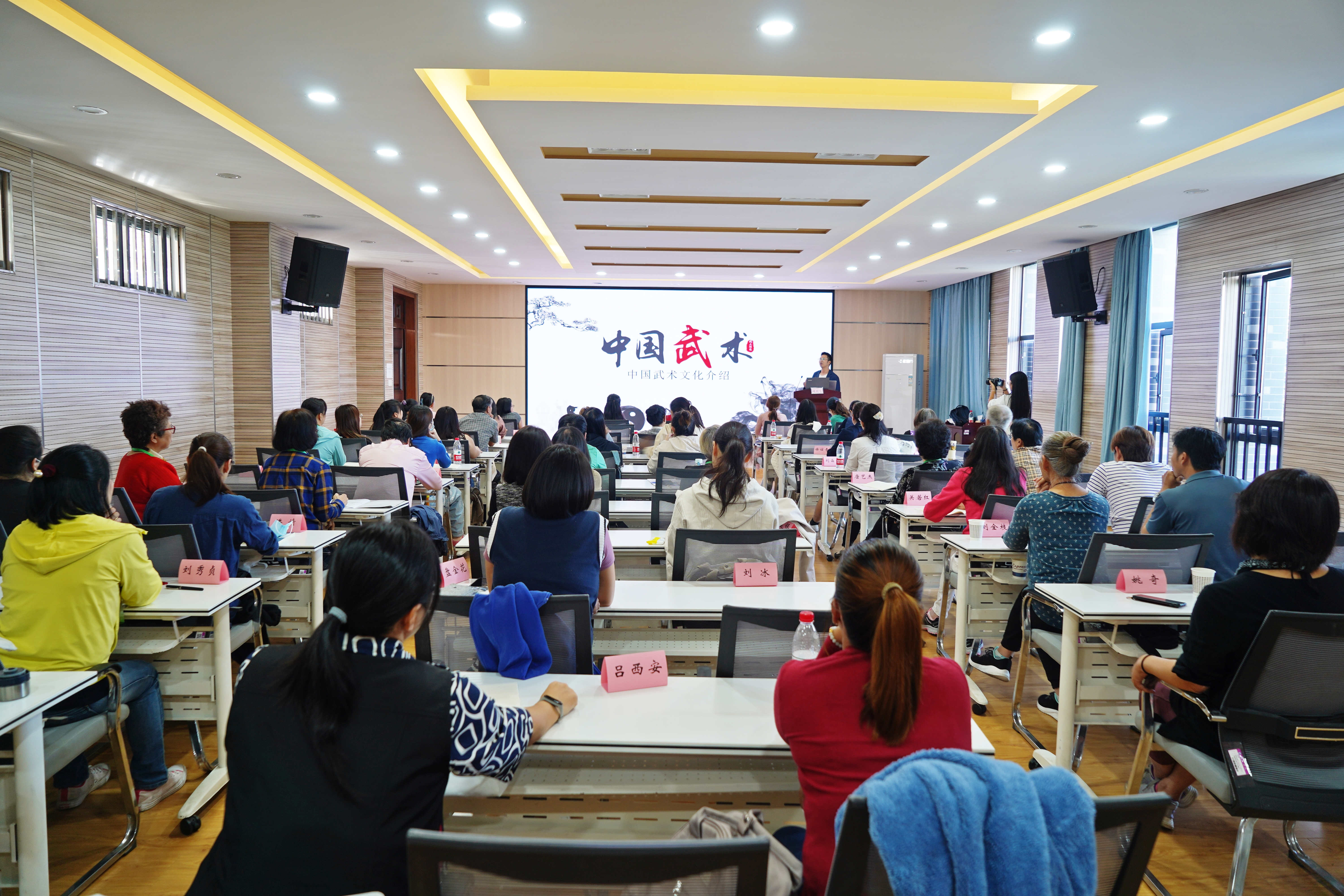 在中国传统武术专题课上,全体学员观看了中华武术展示视频短片,授课教师介绍了中华武术精神的内涵和学习武术的功效。学员们跟着老师一起学习太极拳的入门动作。跟练过程中,授课教师一边耐心讲解动作,一边帮学员进行纠正。随着不断练习,学员们的动作也做得像模像样,诠释了太极拳的魅力。学员们一致表示:“本次课程形式新颖,效果明显,通过理论和实践教学更好地让我们了解了中华传统武术的博大精深。”