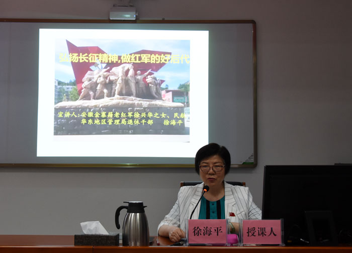 老红军徐兴华后代徐海平为大家作了《弘扬长征精神,做好红军的后代》的专题讲座。徐海平从其父亲加入红军开始说起,用生动朴实的语言讲述了红军长征路上的艰难险阻与不怕牺牲的感人故事。她希望新时代的中国共产党人一要始终学习红军前辈忠诚正直、理想远大的优秀品质,锤炼奋斗与牺牲精神;二要学习红军前辈热爱学习、联系实际的扎实作风,培养进取心与创造力;三要学习红军前辈大公无私、谦虚谨慎的高风亮节,陶冶高尚情操与家国情怀。
