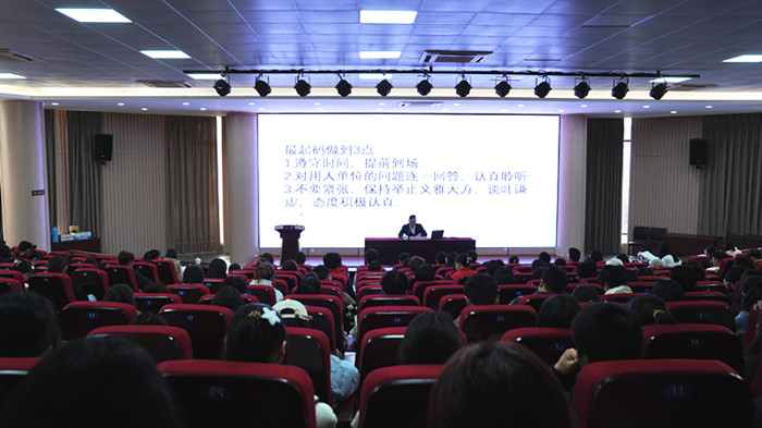 在招聘会开展的同时,我校13级机械制造毕业生丁言圣还开展了就业指导讲座。从求职技巧、就业资源、职业发展、创业机会四个方面为同学们详细介绍关于大学生就业的相关内容,展示求职的关键步骤和实用技巧,给同学们带来了“干货满满”的求职妙招。