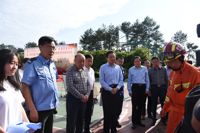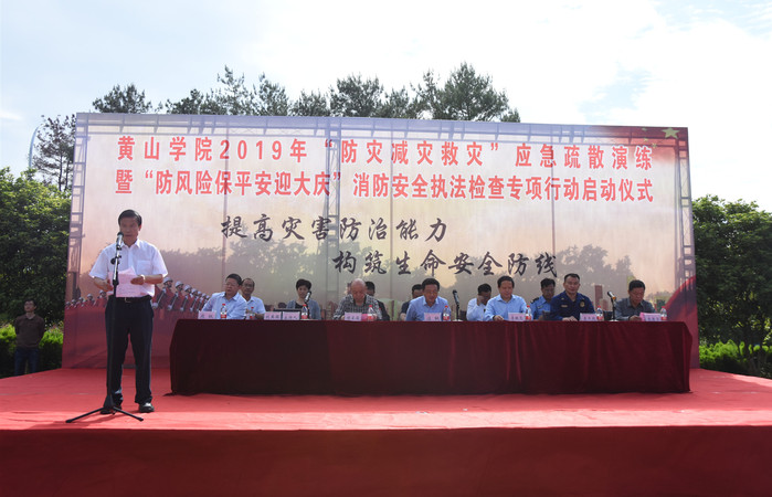 5月29日下午,我校在率水校区一食堂前广场举行2019年“防灾减灾救灾”应急疏散演练暨“防风险保平安迎大庆”消防安全检查专项行动启动仪式。校党委书记汪枫,校党委副书记、校长李铁范,校党委副书记胡家俊,校党委委员、副校长刘英旺,校党委委员、副校长张德学,黄山市消防救援支队副支队长李杰彪出席启动仪式,校安全稳定工作委员会成员、各学院、部门师生代表共1200余人参加启动仪式,启动仪式由刘英旺主持。